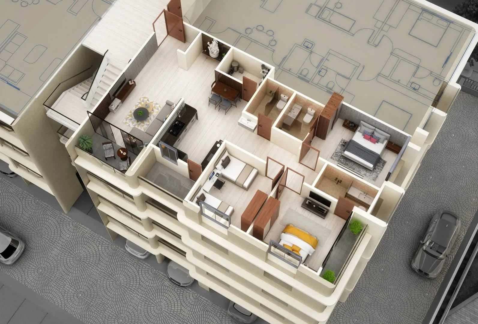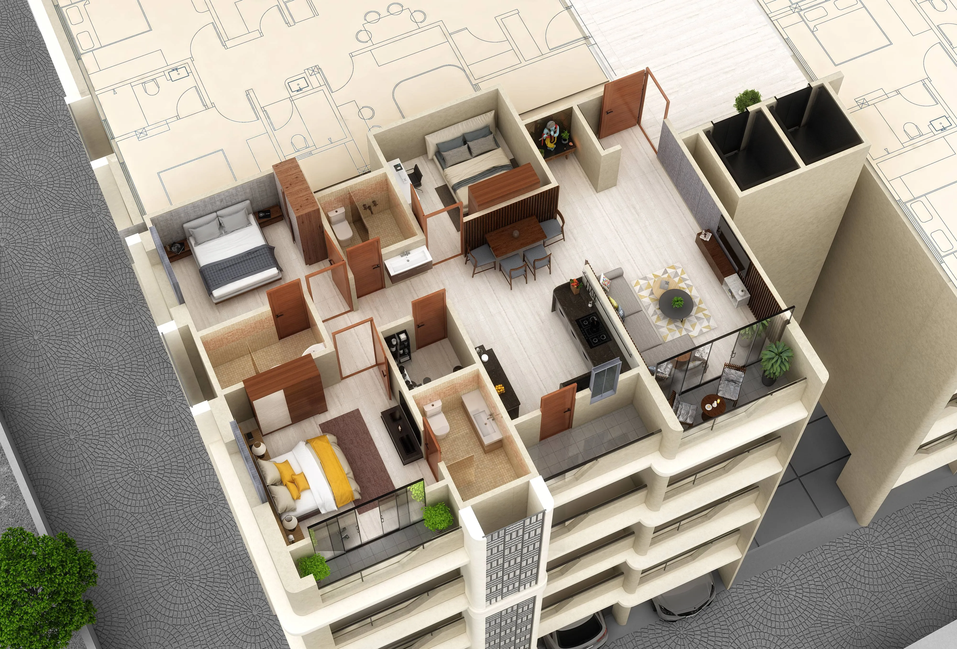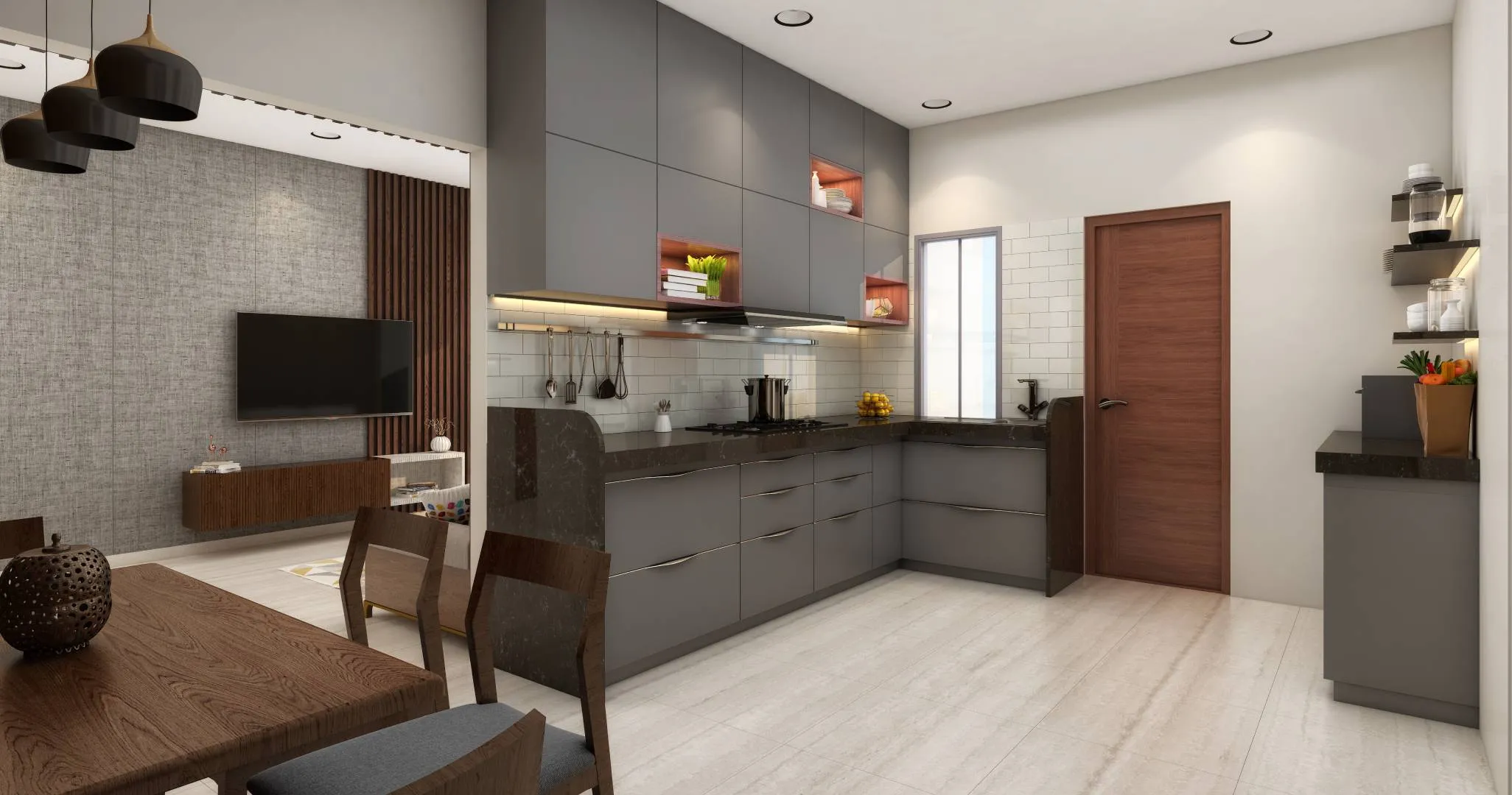 Main Door: Designer flush doors with laminate finish. Other Doors: flush doors.